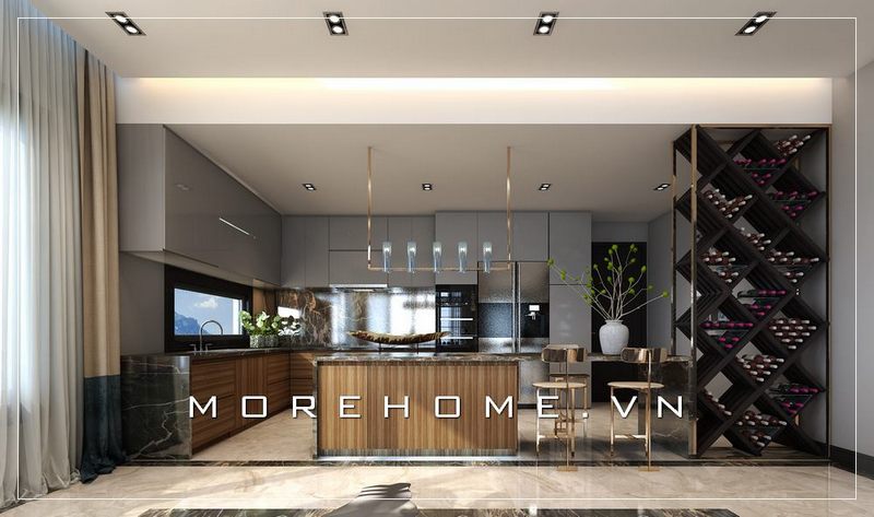 Thiết kế tủ bếp gỗ óc chó kiểu dáng chữ L với kích thước kéo dài hết chiều dài của căn bếp biệt thự mang lại cảm giác vững chãi và đồ sộ cho khu vực nội trợ của gia chủ