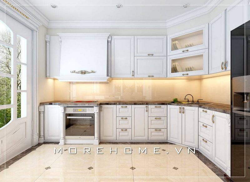 Thiết kế tủ bếp chữ L tân cổ điển với chất liệu gỗ tự nhiên phun sơn trắng lại mang đến cho các thành viên trong gia đình có cảm thấy thân thiết và gần gũi nhau hơn.