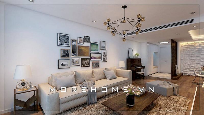 Những bóng đèn hiện đại, cũng tạo ra điểm nhấn cho phòng khách chung cư ánh sáng vàng tạo cảm giác không chói mắt.