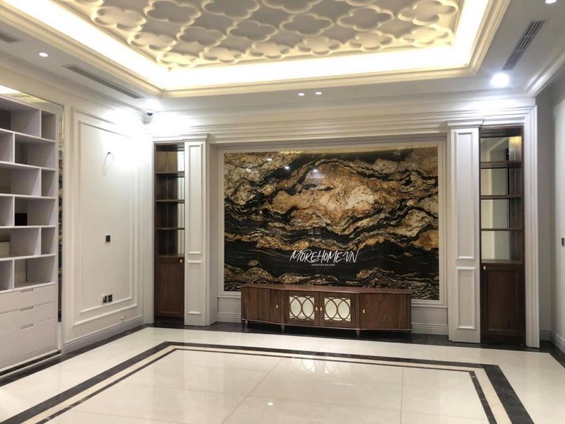 Thiết kế vách tivi bằng đá đối vân cao cấp mang đến điểm nhấn nổi bật, ấn tượng cho không gian phòng khách