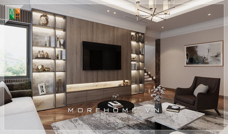 Nội thất phòng khách gồm kệ tivi tân cổ điển và kệ trang trí 2 bên bằng gỗ tự nhiên do Morehome sản xuất và lắp đặt