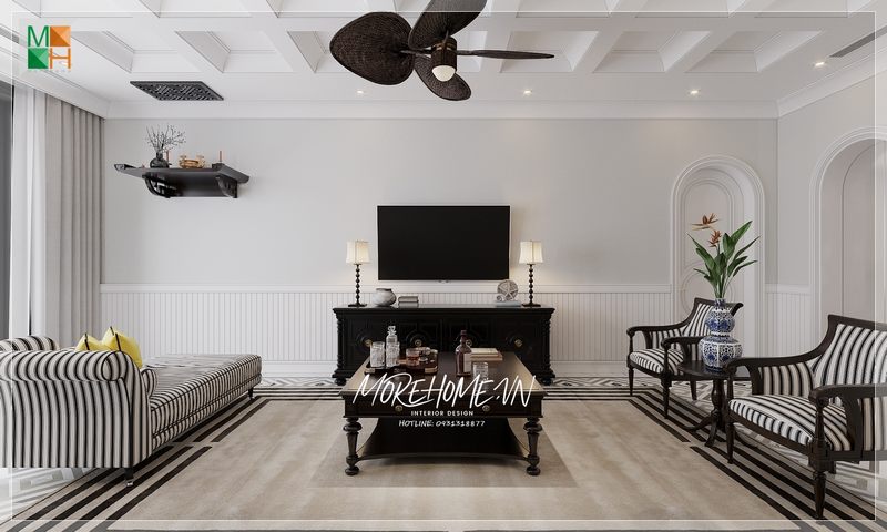 Mẫu thiết kế phòng khách biệt thự theo phong cách Indochine với nội thất gỗ tự nhiên sơn đen kết hợp nỉ sọc cao cấp